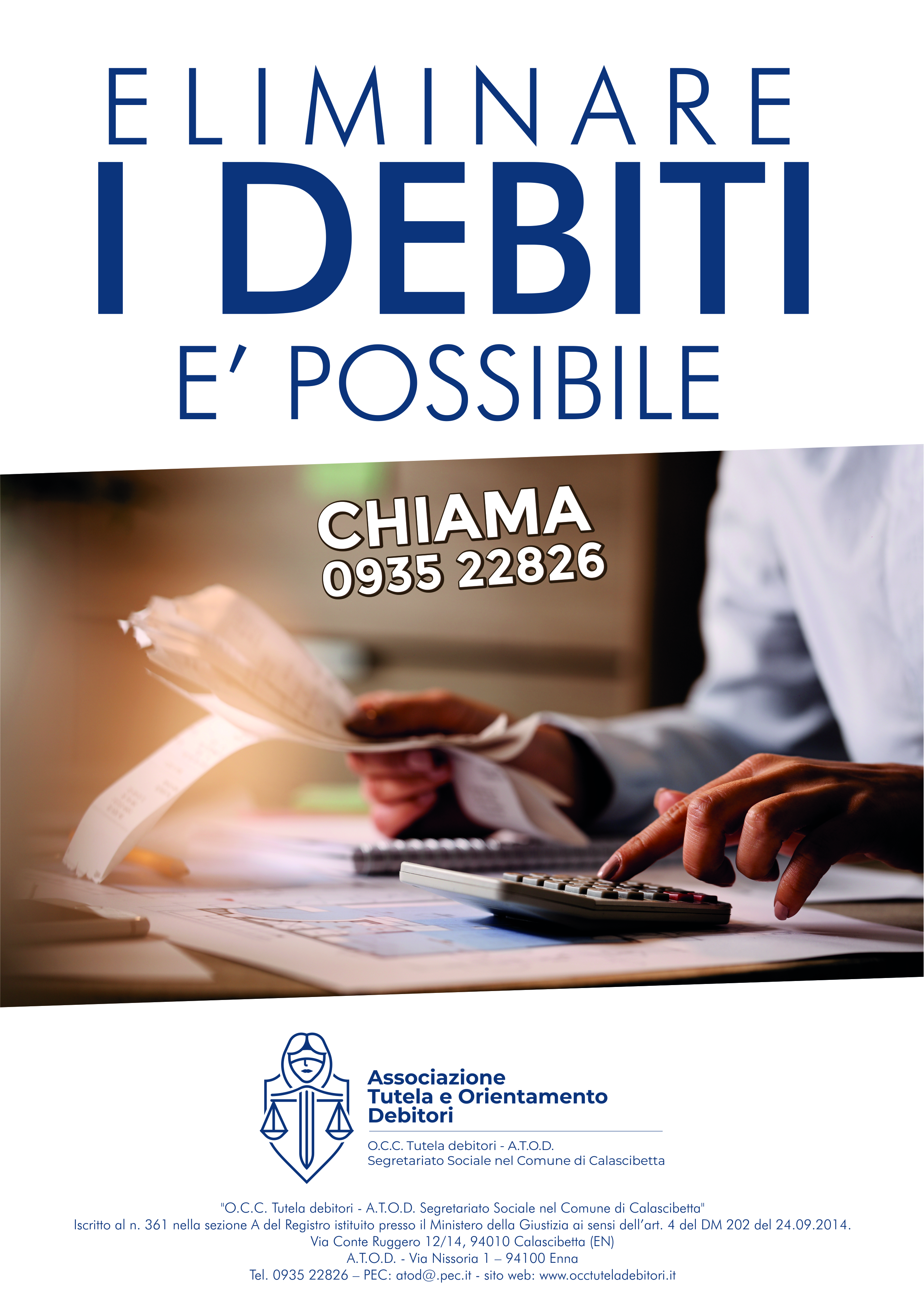 L’Associazione Tutela e Orientamento Debitori (A.T.O.D.) con sede in Enna alla Via Nissoria 1 grazie alla sensibilità del Sindaco del Comune di Calascibetta, ha istituito l’Organismo di Composizione della Crisi da Sovraindebitamento “OCC TUTELA DEBITORI – Servizio di Segretariato Sociale nel Comune di Calascibetta” accreditato presso il Ministero di Giustizia col PDG. N. 361.