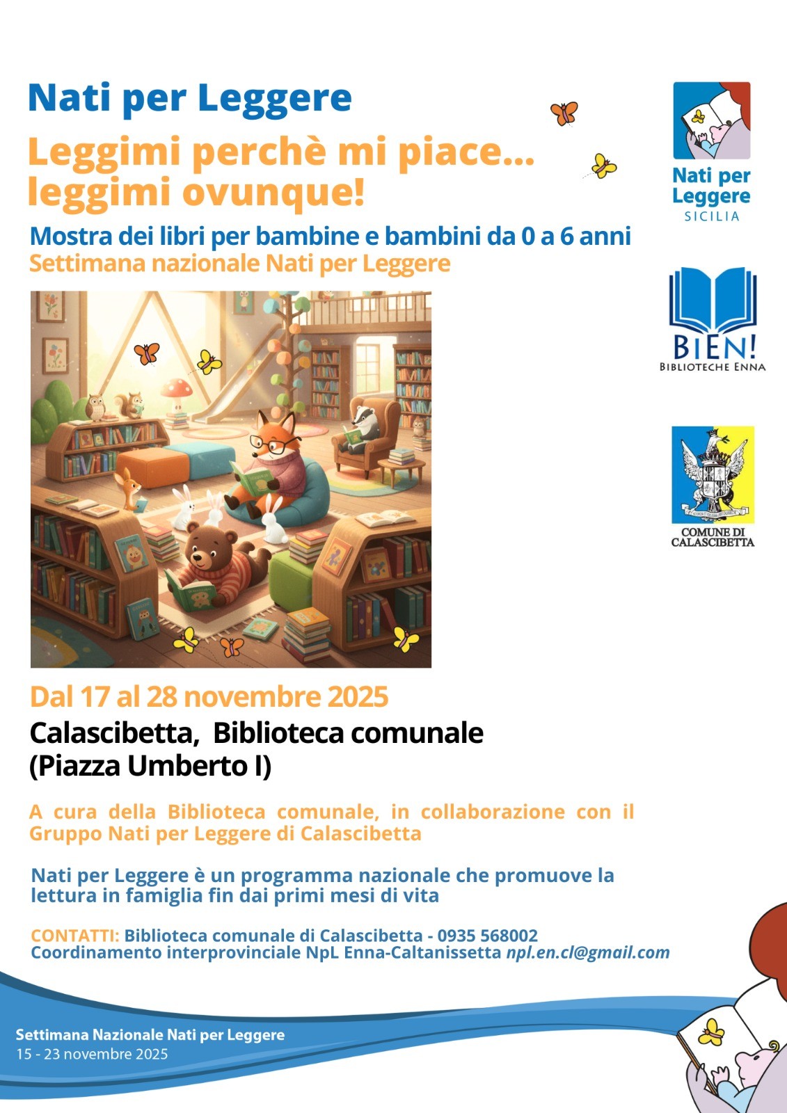 Il Comune di Calascibetta, in collaborazione con il Gruppo Nati per Leggere di Calascibetta, è lieto di ospitare la Mostra dei libri per bambine e bambini da 0 a 6 anni in occasione della Settimana Nazionale Nati per Leggere (15 - 23 novembre 2025).